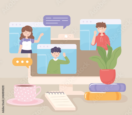 Online communication between two male friends, flat vector illustration. Boys chatting and drinking beer. Online beer party, virtual meeting, live chat video call. Social distancing.