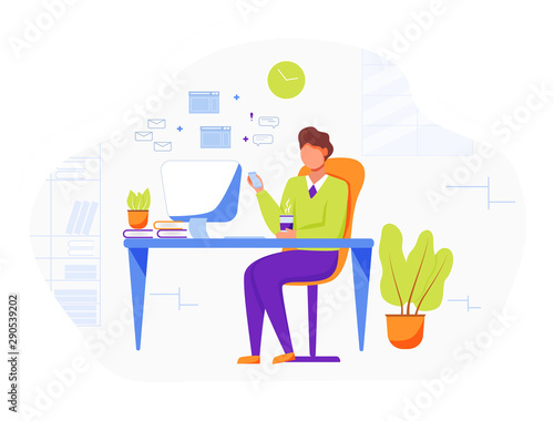 Online communication between two male friends, flat vector illustration. Boys chatting and drinking beer. Online beer party, virtual meeting, live chat video call. Social distancing.
