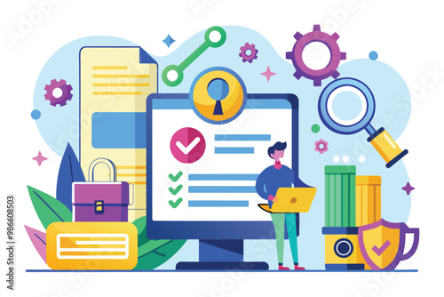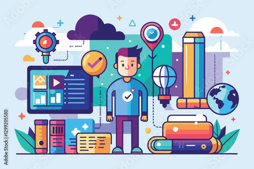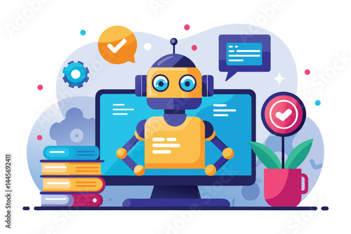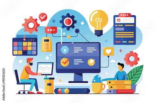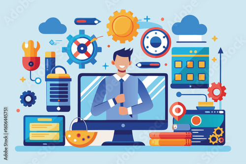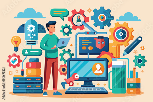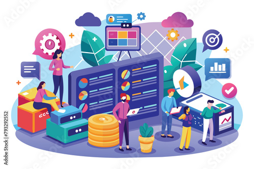 Vector illustration of big mobile phone and characters texting messages using laptop, tablet. Online communication, virtual relationships and social networking concepts for web banner, website page.