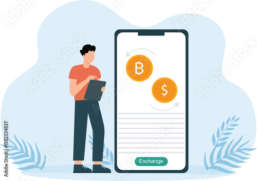 Man asking questions and receiving chatbot answers online, flat vector illustration. Personal virtual assistant, AI chatbot consultant. online customer support, chat bot consulting services.