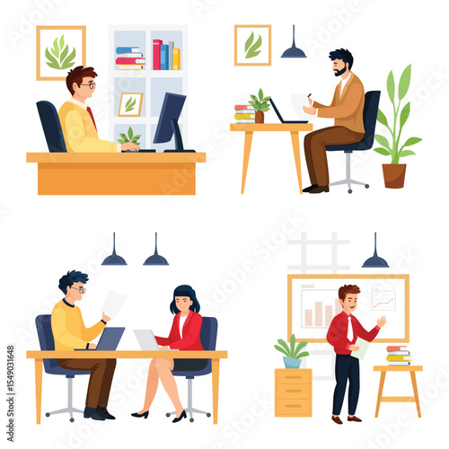 Online doctor consultation, vector flat illustration. Patients communicating with doctors using internet connection and laptop computers. Online counseling, virtual psychological and medical support.