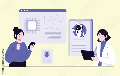 Online doctor helping patient female from computer screen, flat vector illustration. Remote medical consultation, telemedicine.