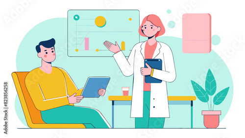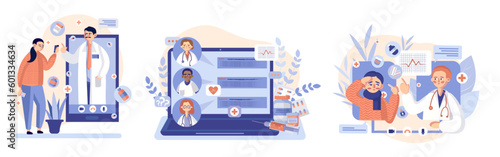 Online doctor on pc computer screen vector illustration. Healthcare virtual service for patient medical consultation from home. Practitioner giving advice for treatment remotely