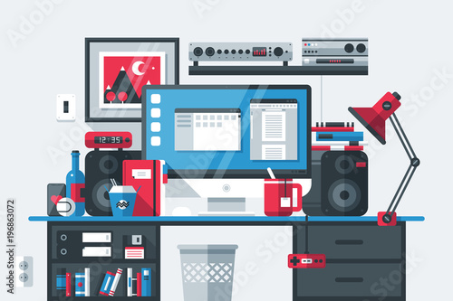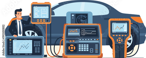Street food kiosk and huge smartphone with credit card, navigation map on screen, vector flat illustration. Fast food delivery and takeaway, mobile ordering and payments.