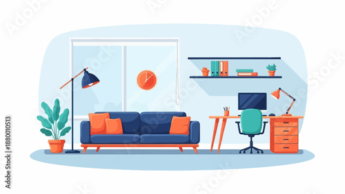 Home interior with furniture and mobile phone with sofa on screen, vector flat illustration. Internet furniture store, online order and delivery services, mobile payments.