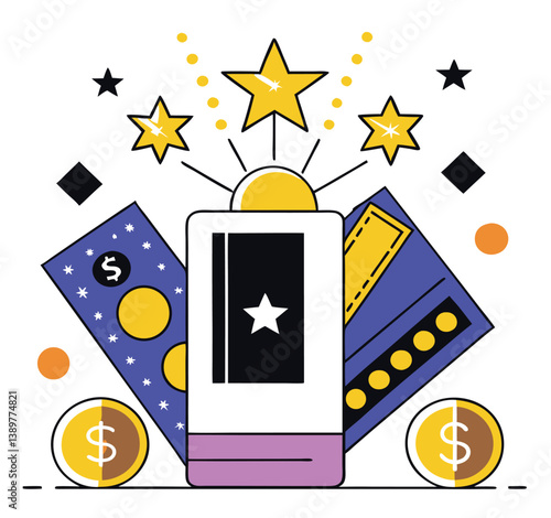 Online gambling vector poster banner design template. Smartphone, roulette wheel, playing cards, slot game, poker chips, dice, dollar coins, trophy cup. Poker mobile app, online mobile casino games.