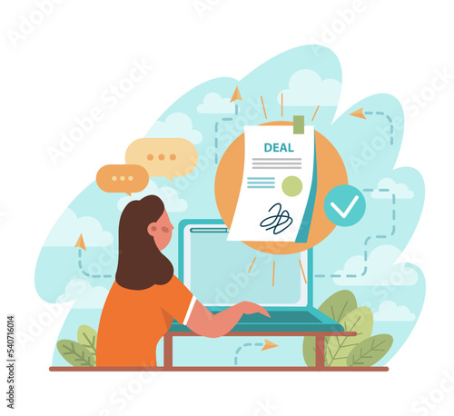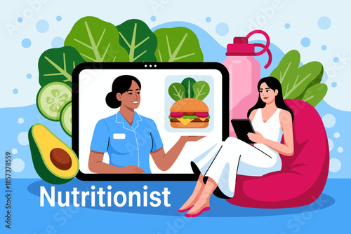 Woman buying grocery products in online mobile store, vector flat illustration. Online grocery shop, internet purchase, e-commerce concept.