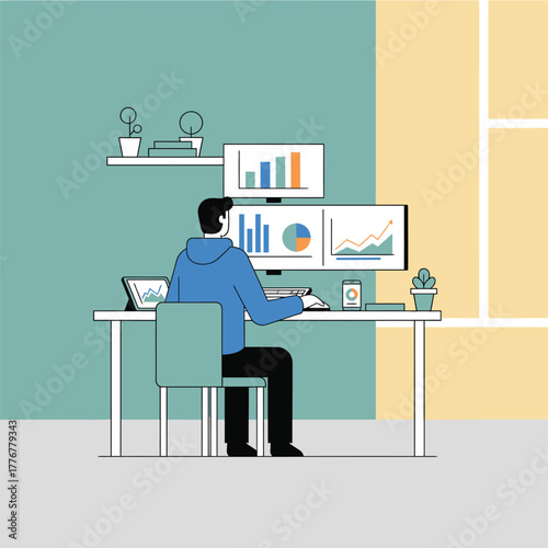 Online hotel booking vector illustration. Man using computer and internet to make a reservation of hotel room flat style design element.