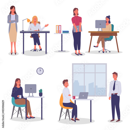 Online job interview character set, vector flat isolated illustration. Hr managers interviewing job candidates. Human resources, hiring, employment, video interviewing, modern communication technology