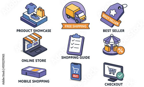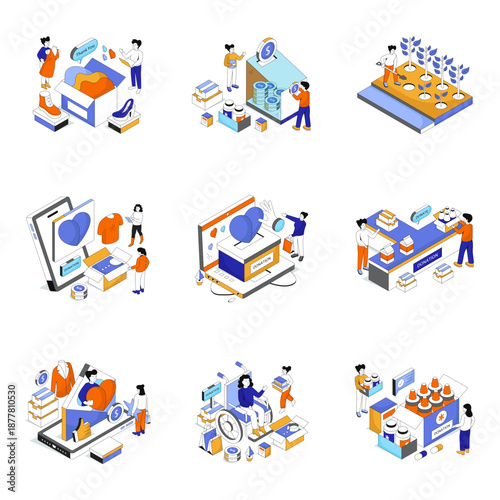 Online medical services vector flat isometric poster set. Online clinical consult, Heart rate monitor, Medication reminder, Emergency alert concept design elements for web banners, print, infographics