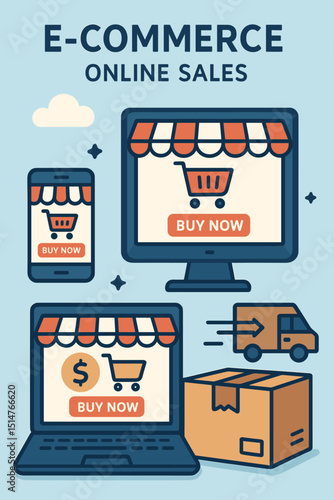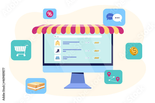 Online mobile shopping concept. Vector illustration in flat style design. Smartphone with purchase icons, bank card, shopping cart, delivery service. Payment on internet.