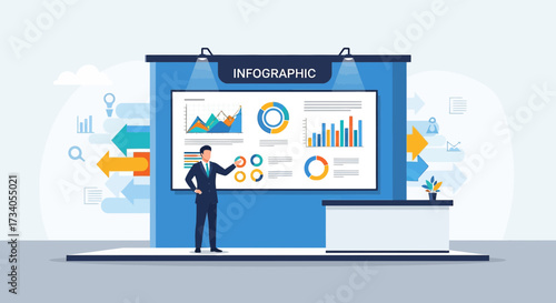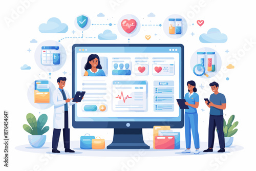 Online poker, vector flat style design illustration. Internet gambling, online casino room concept with tiny characters players, big computer monitor and laptop with playing cards on screens.