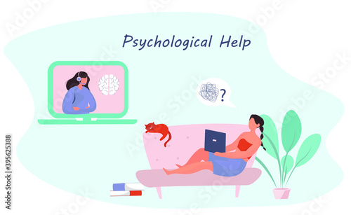 Online psychological help service, vector flat illustration. Psychotherapy session with professional online counselor psychotherapist counseling patient female having emotional, family problems etc.