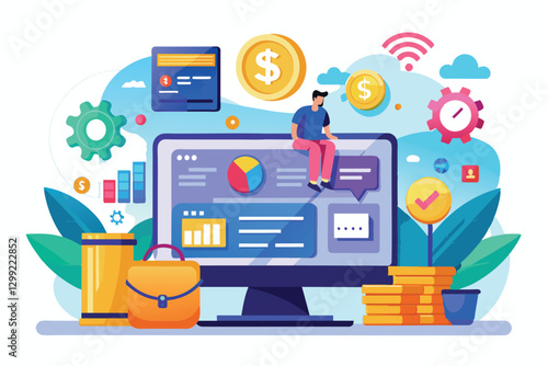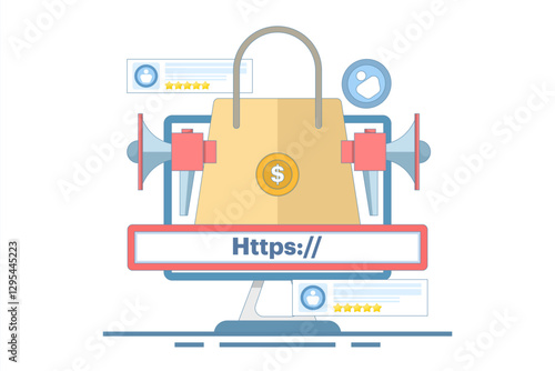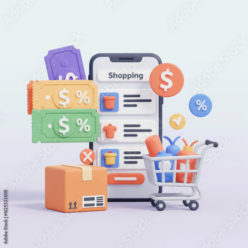 Online sale discount promotion vector 3d illustration. Internet shop store offering gift and bonus for purchase. Virtual application on smartphone. Commercial marketing campaign