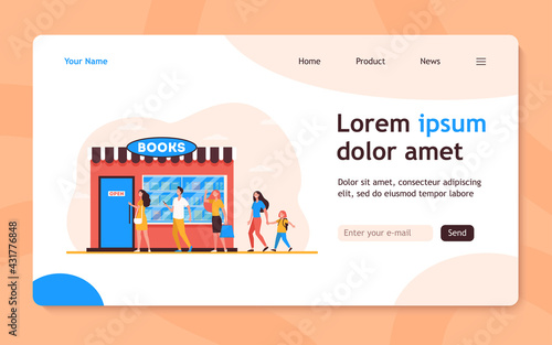 Online shop delivery service vector landing page template. Flat cartoon people order food and clothes on internet using mobile application and e-shop illustration. Shopping and purchases delivering