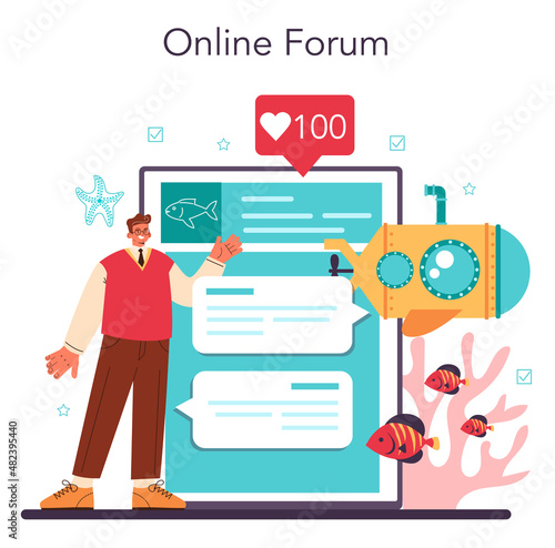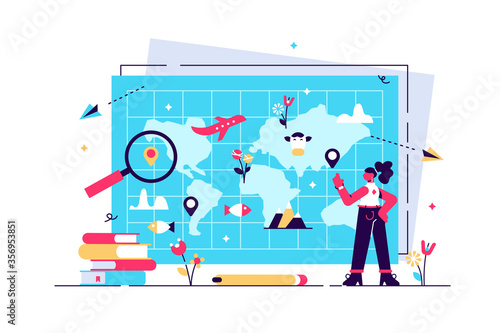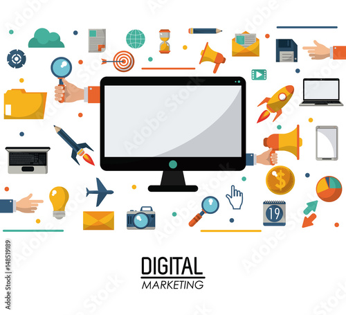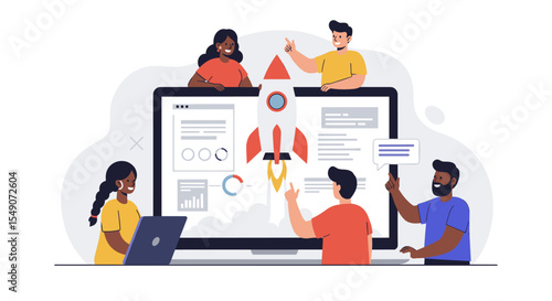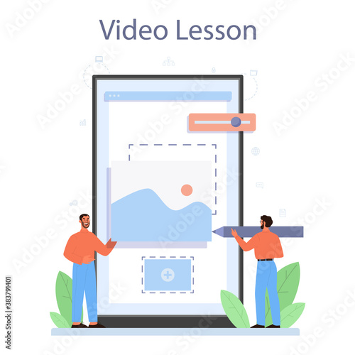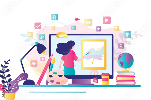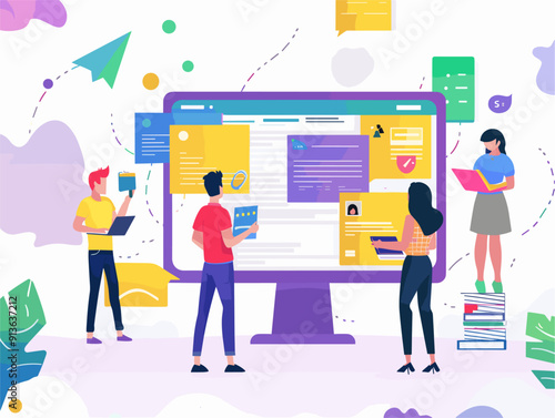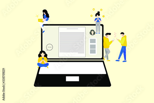 Vector illustration of big computer and tiny people making purchases of bags, shoes in internet shop. Online shopping, e-commerce concept for web banner, website page etc.