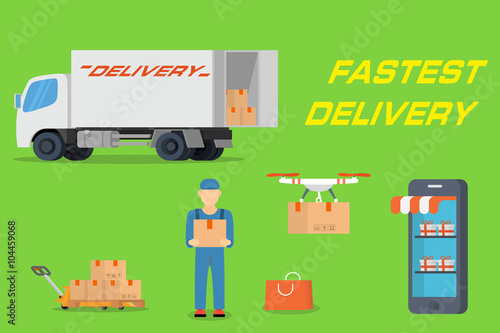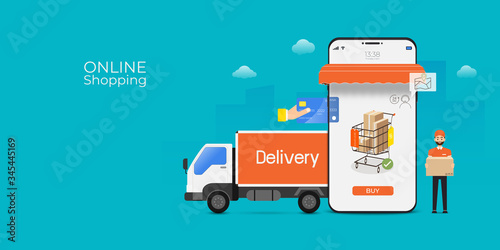Online shop vector flat style design illustration. Mobile phone, tablet, shopping cart, gyroscooter, credit card, purse and cash money. Online store, e-commerce concept for web banner, website page.