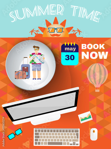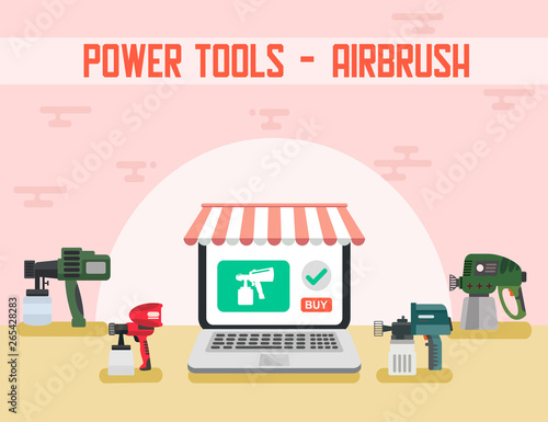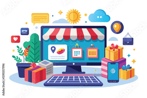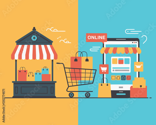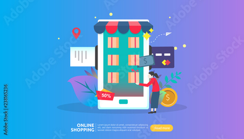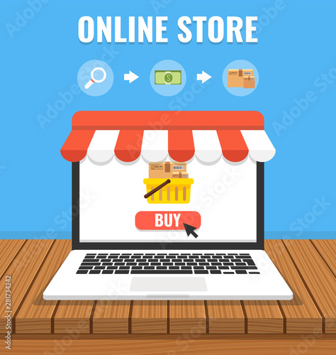 Online shop vector flat style design illustration. Mobile phone, laptop with awning, shopping basket, bag, credit card, cardboard box. Internet store, e-commerce concept for web banner, website page.