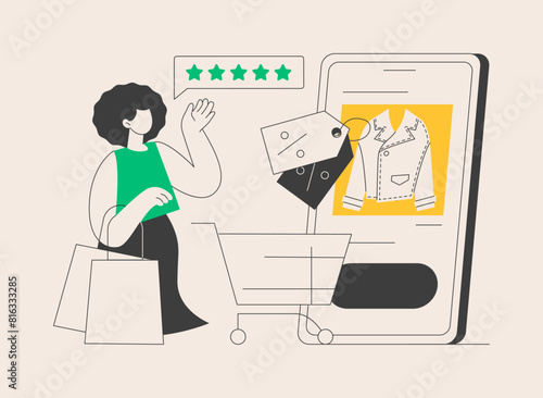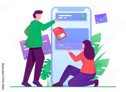 Online shop, vector flat illustration. Big smartphone with bank card and delivery man with cardboard box on screen, tiny women with shopping cart, bags. Online store app, internet payment, delivery.