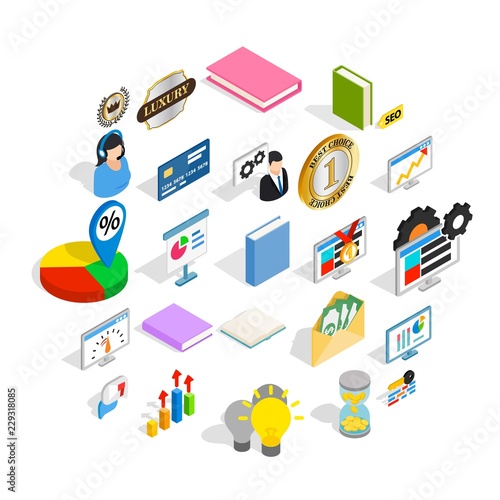 Online shopping and delivery service, isometric icon set, flat vector isolated illustration. Internet store. New arrivals of clothes. Courier delivering parcel from shop to customer home door.
