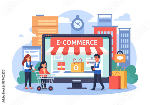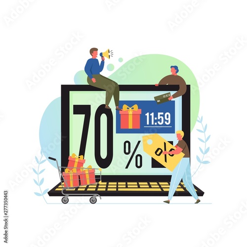 Online shopping clearance sale, deals, vector flat style design illustration. Great offers and discounts concept with big laptop and tiny characters for web banner, website page etc.