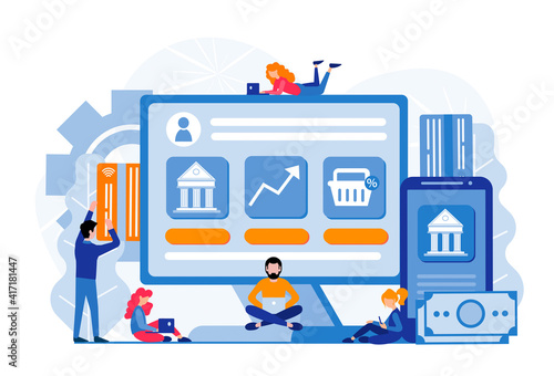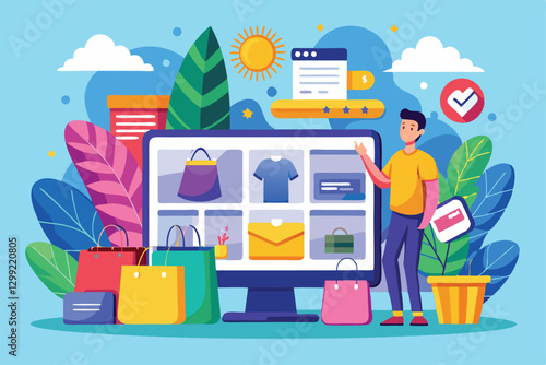 Best online shopping offers, vector flat illustration. Gift box, 70 percent hot sale text on big computer monitor screen and tiny characters. Internet store discounts concept for web banner etc.