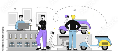 Huge tablet with awning, micro female characters choosing clothes in internet store and paying online, vector flat style design illustration. E-commerce, online shopping concept.