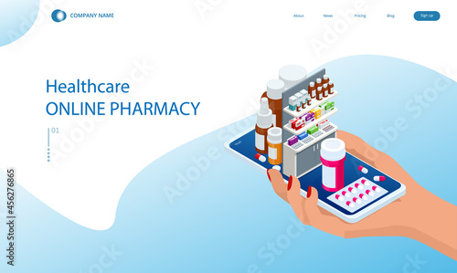 Online shopping landing page template for website and mobile site development. Vector isometric mobile phone, woman with shopping cart full of purchases, credit card. Internet store web page concept.