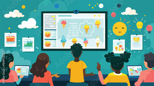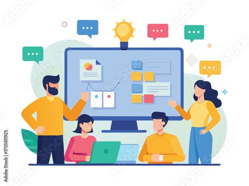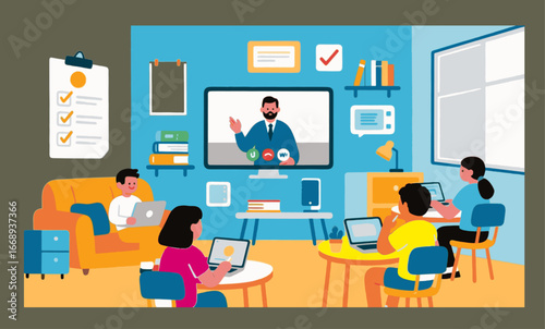 Group of business people taking part in online video conference using laptop and desktop computers, tablet, mobile phone, vector flat illustration. Videoconferencing, online meeting and webinar.