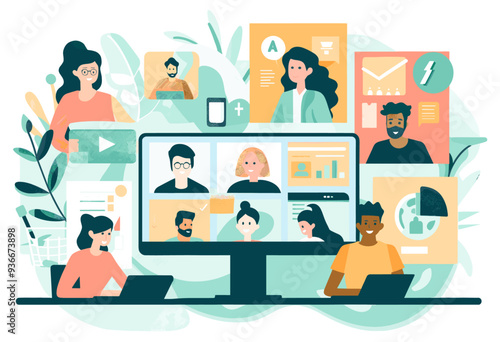 Business people video conference participants using laptop, desktop computers for online communication, meeting, vector flat illustration. Video conferencing technologies, webinar, online training.