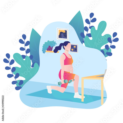 Girl with headphones and smartphone doing warrior 2 yoga pose at home together with online coach on mobile screen, vector flat style design illustration. Online classes for yoga and meditation.