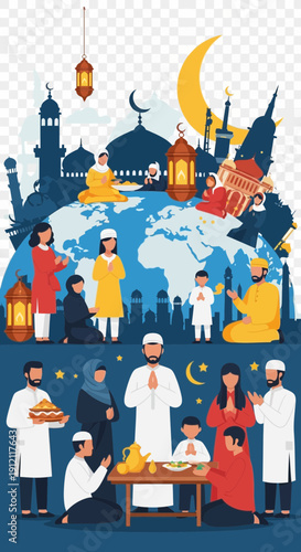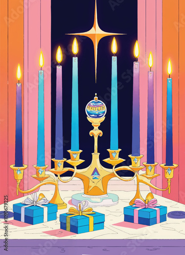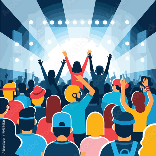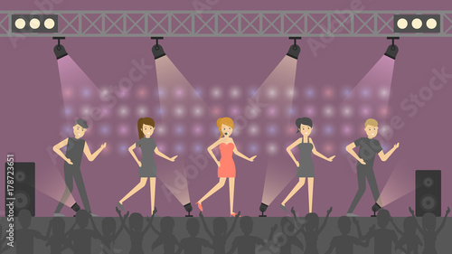 Opera theater scene with red curtains. Symphony orchestra performing on stage, vector illustration. Conductor and musicians playing violin, double bass, flute, tuba. Classical music concert.