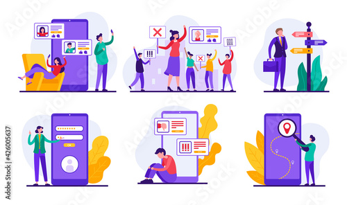 Ophthalmology set, flat vector isolated illustration. Doctor oculist patient characters. Chart for eye check up. Ophthalmologist eyesight examination, vision test. Optometry, ophthalmology diagnostics