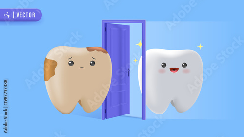 Oral care dental floss vector poster, banner template. Smiling healthy white teeth cartoon characters with string dental floss in container. Children dentistry, oral health, teeth cleaning and hygiene