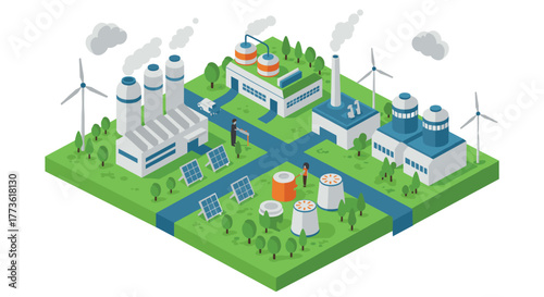 Organic farming. Greenhouse, wind turbines and solar panels, flat vector isometric illustration. Glasshouse using clean energy from sun and wind. Green alternative energy. Eco farm.