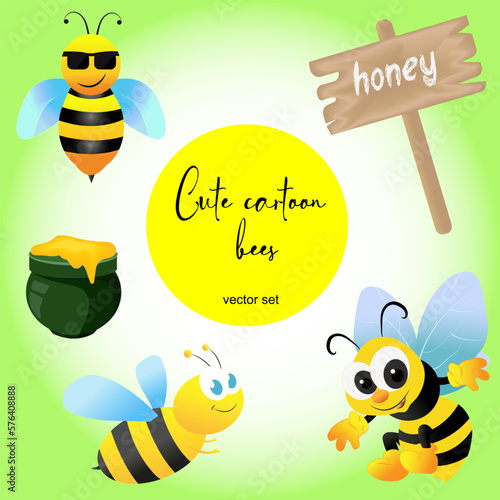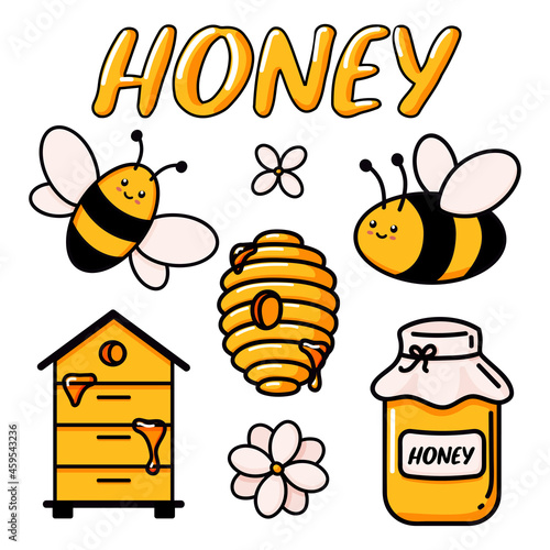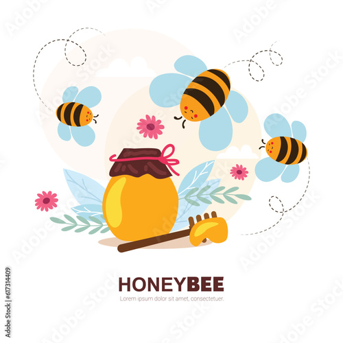 Organic honey icon. Vector sticker, label or logo with headline text, bee and sweet nectar in jar design isolated on white background
