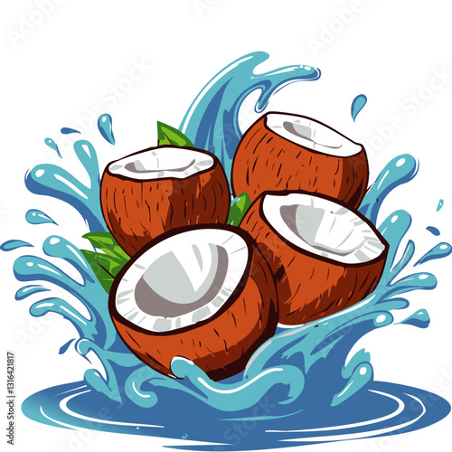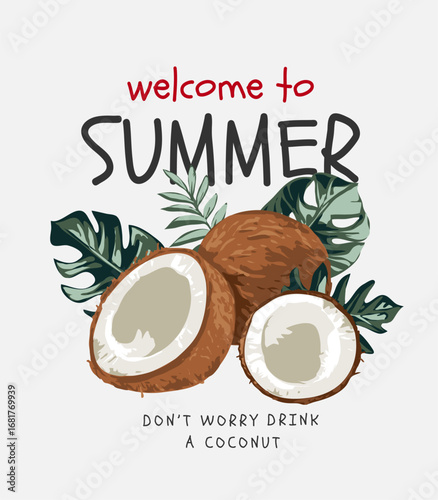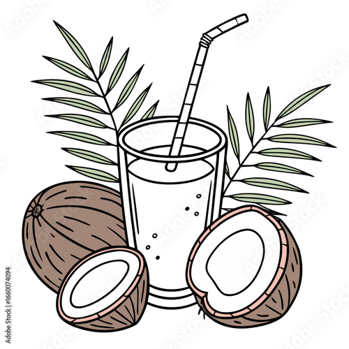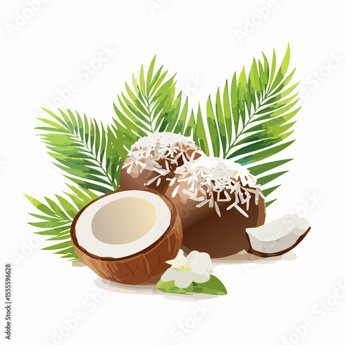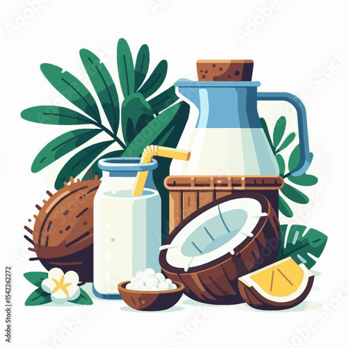 Coconut water vector illustration. Realistic composition of organic drink in aluminium can, cocos, palm leaves for poster, banner, etc. Refreshing coconut juice packaging.