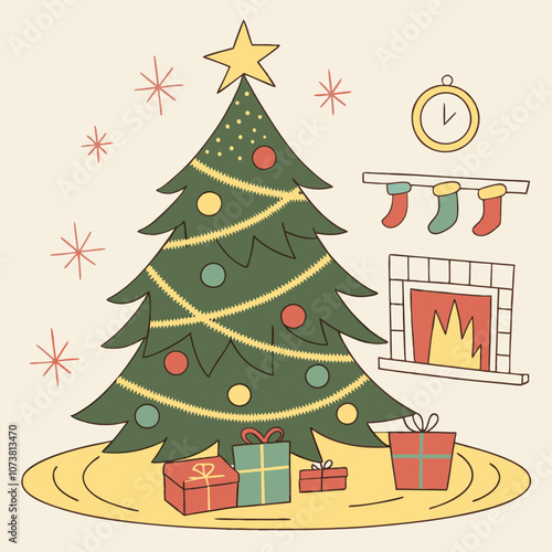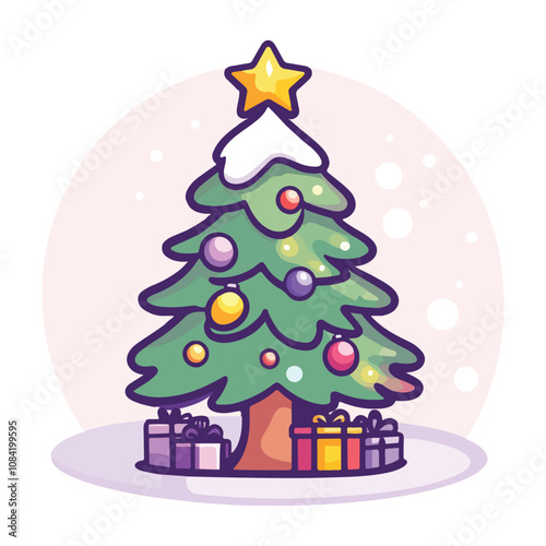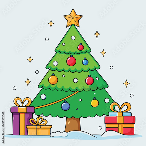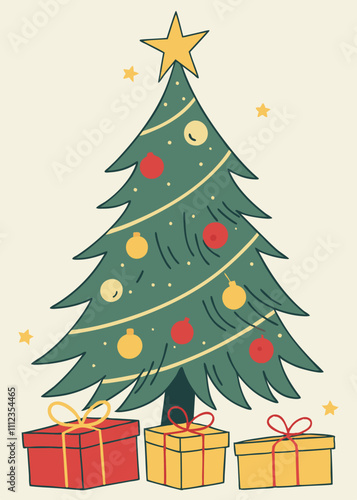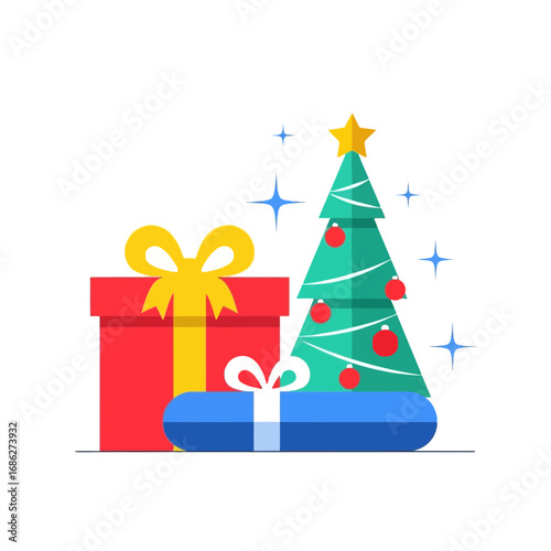 Origami Christmas tree with gift box and lantern vector design. Xmas present and greeting to happy new year illustration. Festive card, poster or banner template