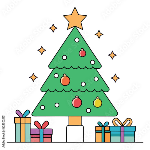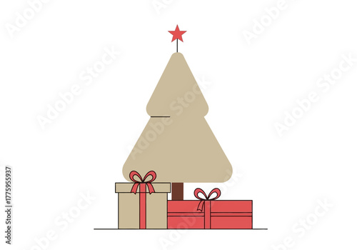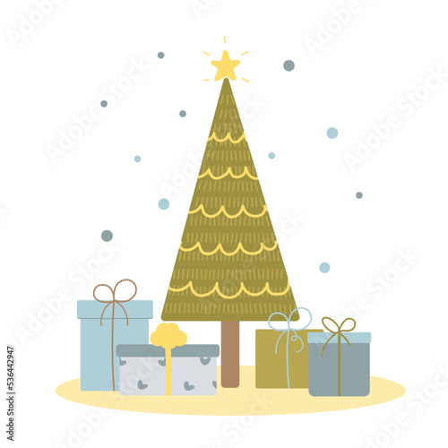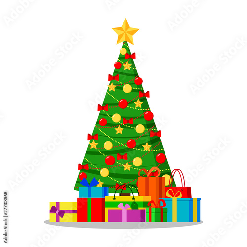 Christmas tree with star and gift vector. Origami fir decorated to Merry Xmas and Happy New Year. Decoration bauble ball, present box with surprise illustration for greeting card in paper cut style