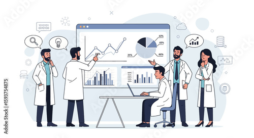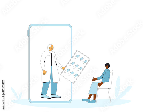 Osteopathy session and treatment. Man suffering from spine pain visiting osteopath, flat vector illustration. Tiny doctor characters examining patient vertebra. Osteopathic physician consultation.