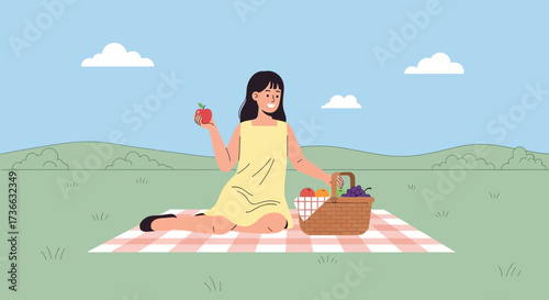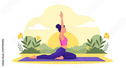 Outdoor yoga class in nature mountain landscape. Yoga exercise concept vector illustration. Man and woman training together, cartoon characters. Healthy lifestyle, sport activity.
