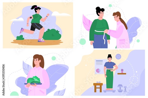 Overweight female character set, vector flat isolated illustration. Plus size girls in front of mirrors, on scales. Unhappy women suffering from obesity. Weight problems and diet, obesity depression.