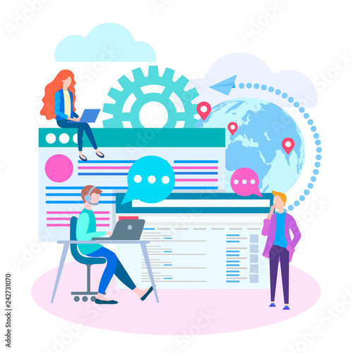 Page not found, system update, website maintenance, vector flat illustration. Tiny people system administrators fixing 404 error. Site, webpage under construction concept.