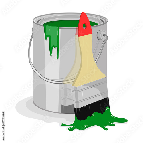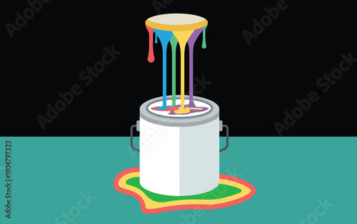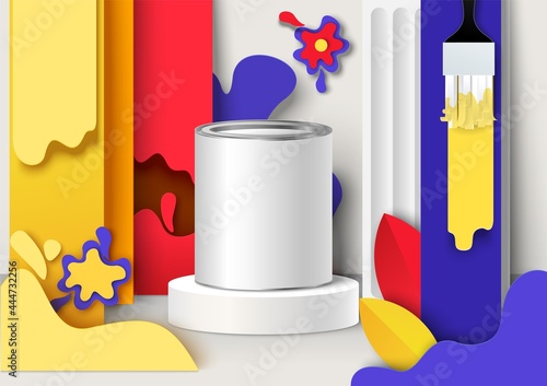 White blank paint packaging can, container mockup on display podium, paper cut background with color paintbrush strokes, vector illustration. Paint for home renovation ads template.