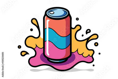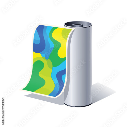 White blank paint packaging can, container mockup on display podium, paper cut background with color paintbrush strokes, vector illustration. Paint for home renovation ads template.