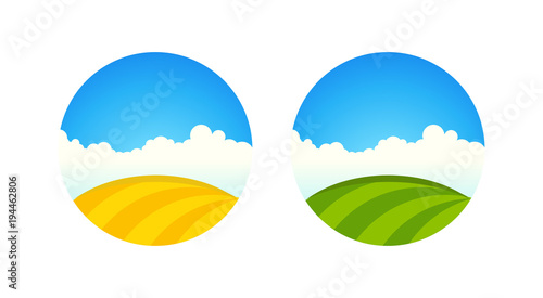 Panorama view on green field over cityscape skyline with residential apartment houses vector illustration in paper cut craft style. Summer or spring landscape nature scene background