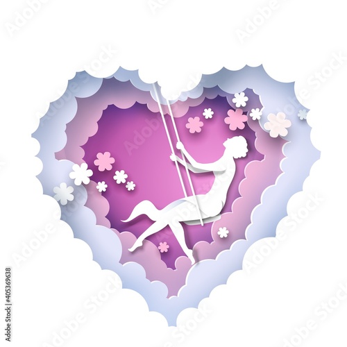 Paper cut craft style heart with young woman silhouette swinging on swing, vector illustration. Romantic girl. Valentine Day greeting card.