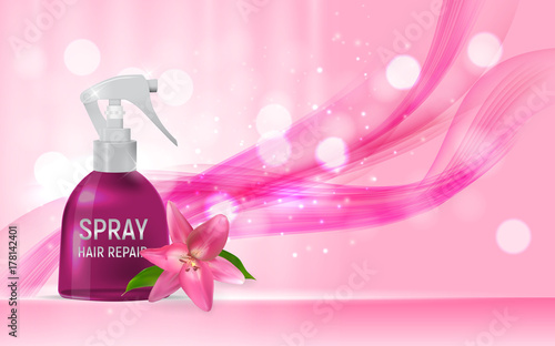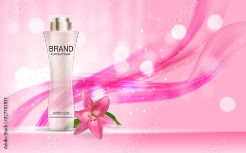 Paper cut flower with realistic plastic cosmetic pump bottle, vector illustration. Body lotion, soap. Beauty and skin care cosmetic product branding mockup, advertising.