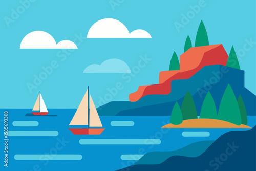 Papercut nature background. Mountain landscape 3d art vector. Origami spring field environment with grass land, sky and rock peak, boat floating in river illustration
