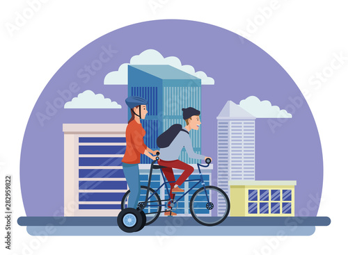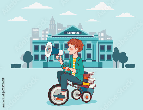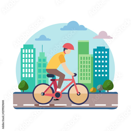 Happy father teaching his kid boy to ride bicycle running behind him, vector flat illustration. Parenting, happy fatherhood and childhood, parent child relationship, parental love and care for kids.
